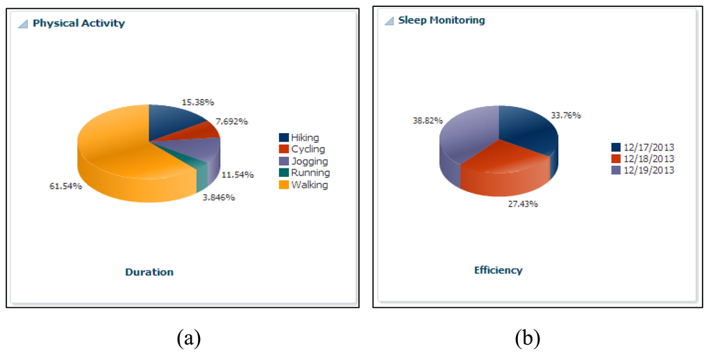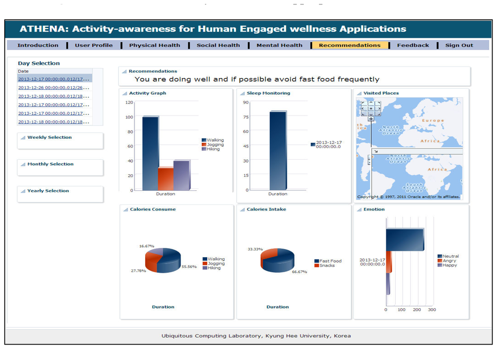 Plenty of research has been conducted on effective information visualization, but it has not all focused on personal data. Commercial products, such as Nike+ [], Run Keeper [] and Sleep as Android [], can provide assistance to visualize the information. These products are less focused on covering the physical, mental and social interaction health primitives all together. We explore the existing strong connections between the health primitives and describe how existing technology can provide an echo system to promote an active lifestyle. We maintain the user's profiles to deliver personalized wellness recommendations. In addition, providing the current status and their history, people can figure out what goals will be appropriate for them to pursue; for example, maintaining the weight of users' requires keeping a balance in food intake or physical exercise. On the other hand, users' sleep efficiency is decreased, and they feel tired in daily routines. Instead of leaving physical exercise, users can track what kind of food they took and which time they went for exercise. ATHENA can provide recommendations, such as “do not do physical exercise or take coffee X hours before sleeping”. In this way, a user can change his lifestyle while adopting an active lifestyle.