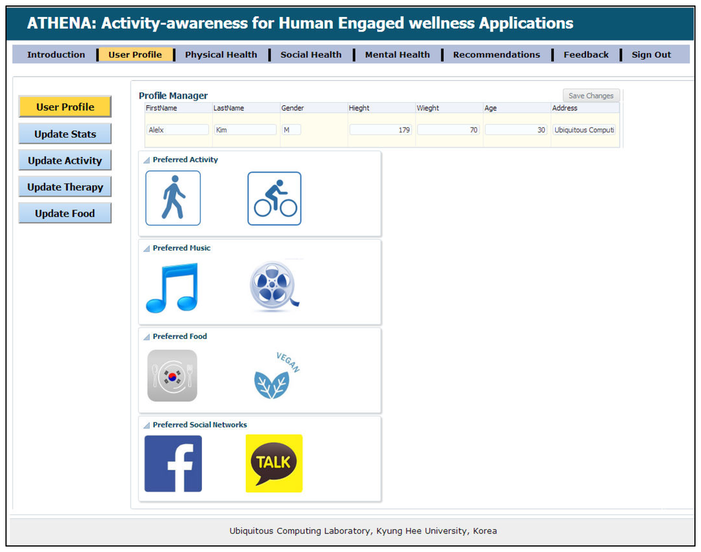 To provide customized services, personal information, such as gender and age, plays an important role. Once we know about personal information, then one is more likely to adopt the provided recommendation. When new users register to our ATHENA platform, we ask about the subject's preferences in terms of preferred exercise activity, food, music and connected social networks. Once the inference and reasoner module generates the recommendations and interventions, the system sorts them out on the basis of the user's preferences.