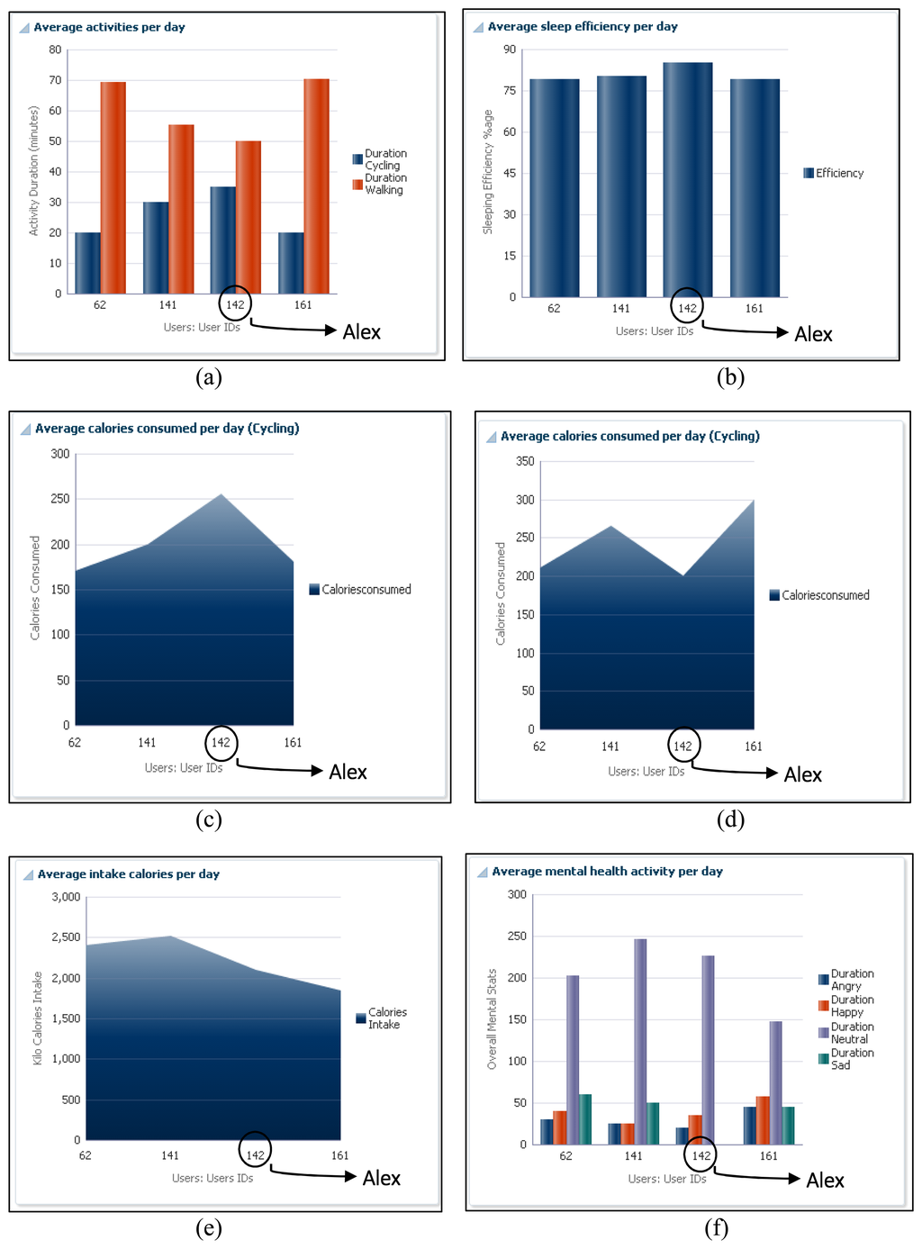 The ATHENA platform also provides a comparative analysis for individuals based on body mass index (BMI) ranges. In order to maintain the privacy of user's, we assign the user identities and group people according to subject interests. In scenario for Alex, we compared his physical activities, consumed calories during exercise, intake of calories in terms of food, sleep efficiency and mental health, with a similar group. In Figure 7a, his cycling activity is more than the other group of persons, while walking is less than the others. Figure 7b shows that sleep efficiency is more than the others. Similarly, in Figure 7c, he consumed more calories as compared to the other group members and performed more cycling vice versa (i.e., Figure 7d). Comparing his mental health, it is observed that his average level of happiness is more than the mentioned group of people, and he is less sad.