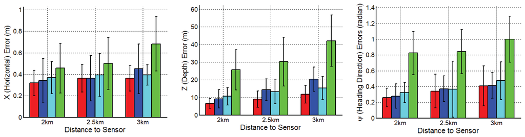The ATR performance of four shape models was evaluated with respect to three figures of merit: (1) px (horizontal) position error (in meters); (2) pz (slant range) position error (in meters); and (3) heading direction error ψ (in rads). Quantitative tracking performance results are reported in Figure 10, which give the horizontal, slant range and heading direction tracking errors, respectively, averaged over the eight target types for each range. It is shown that JVIM gains 9%, 10% and 35% improvements over CVIM, LL-GPLVM and NN along the horizontal direction, respectively, 35%, 31% and 72% along the slant range, respectively, and 5%, 13% and 62% along the heading direction, respectively. The results demonstrate that JVIM delivers better tracking performance with respect to all three figures of merit, with the advantage over CVIM, LL-GPLVM and NN being particularly significant for the range estimation.