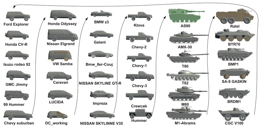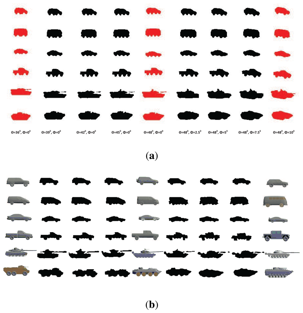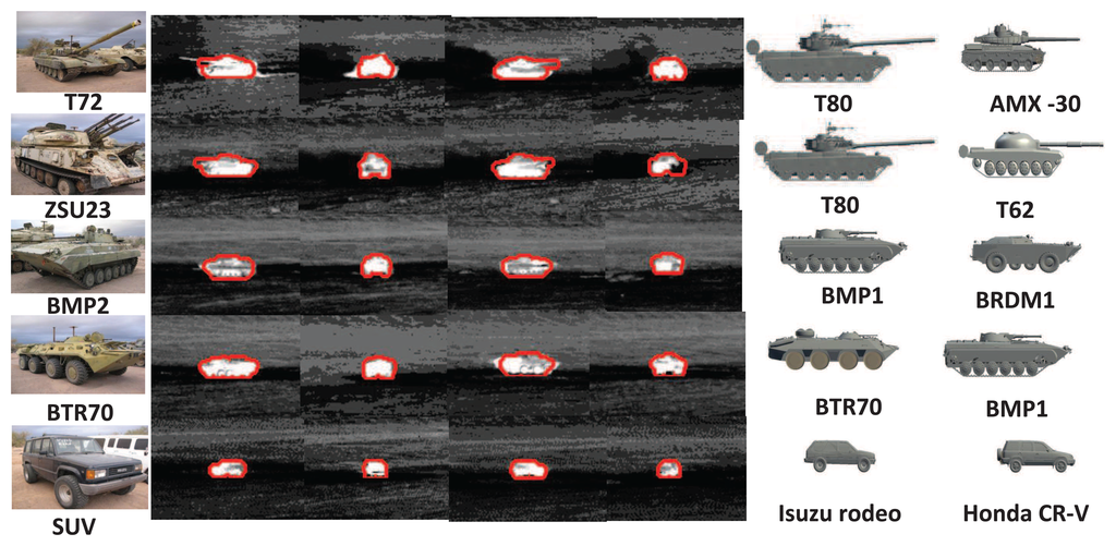 In our work, we considered six target classes as [8], i.e., SUVs, mini-vans, cars, pick-ups, tanks and armored personnel carriers (APCs), each of which has six sub-classes, resulting in a total of 36 targets, as shown in Figure 8. These 36 targets were ordered along the view-independent identity manifold according to a unique topology optimized by the class-constrained shortest-closed-path method proposed in [8] (before training). We considered aspect and elevation angles in the ranges 0 ≤ θ < 2π and 0 ≤ ϕ < π/4, which are digitized in the interval of π/15 and π/18 rad, respectively. A total of 150 training viewpoints were used for each target; all training data are generated by their 3D CAD models. In order to reduce the data dimension, the DCT-based shape descriptor proposed in [7] was used here to represent all training shapes for manifold learning. We first detect the contour of a 2D shape (120 × 80) and then apply the signed distance transform to the contour image, followed by the 2D DCT. Only about 10% DCT coefficients are used to represent a shape, which are sufficient for nearly lossless shape reconstruction. Another advantage of this shape descriptor is that we can do zero-padding prior to inverse DCT to accommodate an arbitrary scaling factor without additional zooming or shrinking operations.
