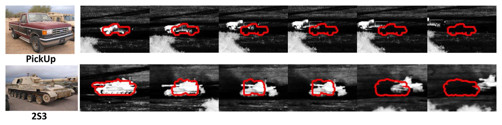 There are two limitations of ATR-Seg due to the unsupervised nature of the level set, where no prior is used for foreground/background pixel intensities, and the mismatching between the training targets and the test ones. Thus, when a major part of a target is occluded or part of a target is similar to the background, the shape-aware set will lose the sensitivity for segmentation evaluation, leading to tracking failure, as shown in Figure 13 (first row), which shows the failed results for the pick-up sequence at 1.5 km. The mismatching and the low-quality data are the main reasons for the tracking failure of 2S3 at a range of 1.5 km (second row in Figure 13). One possible remedy is to incorporate some pixel priors of background and foreground into the level set energy function. However, an online learning scheme may be needed to update the pixel priors that are usually necessary for a long infrared sequence [31]. It is worth emphasizing that the goal of this work is to test the potential of a “model-based” approach that only uses CAD models for training. It is a natural extension to incorporate real infrared data for training that is likely to improve the algorithm robustness and applicability significantly.