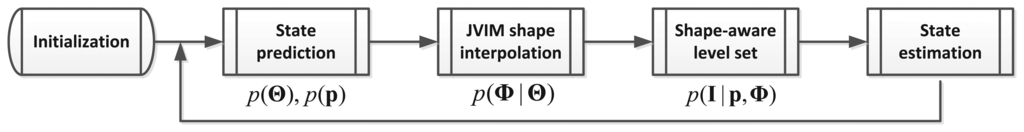 The flowchart for ATR-Seg is shown in Figure 2 where four steps are involved sequentially and recursively. First, state prediction will draw a set of samples to predict all state variables (position/angle/identity). Second, a series of shape hypotheses are created via JVIM in some hypothesized locations according to predicted state information. Third, a level-set energy function is used as the likelihood function to weight each hypothesized shape/location that quantifies how well that shape can segment a valid target in that particular location. Fourth, state estimation at the current frame is obtained by the conditional mean of all weighted samples and will be used for state prediction in the next frame.