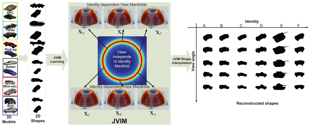 JVIM is learned from a set of 2D shape exemplars Y generated from a set of 3D CAD models. The latent space X can be represented by two variables, identity α and view φ (including aspect angle θ and elevation angle ϕ), which are defined along their respective manifolds. Considering the fact that all targets have different 3D structures, leading to different view manifolds, and they keep the same identity under different views, we impose a conditional dependency between α and φ in JVIM that encapsulates one view-independent identity manifold and infinite identity-dependent view manifolds. Specifically, the identity manifold represents the view-independent shape variability across different target types, and an identity-specific view manifold captures the shape variability of a target under different views. Motivated by [8,23], the identity manifold is simplified to have a circular-shaped topology prior, which facilitates manifold learning and shape inference. Intuitively, a hemispherical-shaped topology prior is assumed for identity-specific view manifold, which represents all possible aspect and elevation angles for ground vehicle. All topology priors are encoded by LLE and incorporated into the GPLVM-based learning framework, as shown in Figure 3.