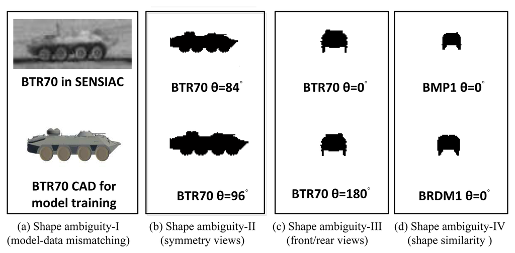 This method works well on a single image when a good initialization is given in the latent space of JVIM. However, it may fail quickly when dealing with an image sequence with a highly maneuverable target, due to four possible cases of shape ambiguity, as shown in Figure 6, which makes data-driven optimization not reliable in practice. (1) The first is due to the possible shape mismatch between the CAD models and real targets, even for the same target type (Figure 6a). (2) The second is due to the symmetry property of a target's shape (Figure 6b), which means a target may present a similar shape at different (e.g., supplement) aspect angles, especially when the elevation angle is zero (Figure 6b). (3) The third is due to the ambiguity of the front/rear views when a target looks very similar (Figure 6c). (4) The fourth is similar to the previous one in which many targets look alike at the front/rear views (Figure 6d). These factors make the gradient-based approach not effective at dealing with a maneuvering target. A possible remedy is to introduce a dynamic motion model to support robust sequential shape inference based on JVIM, as to be discussed below.