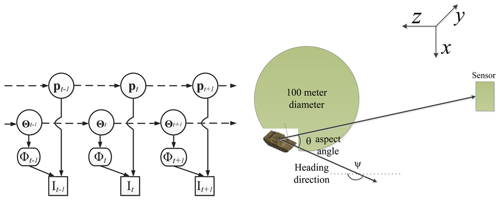 Due to the nonlinear nature of Equation (20), we resort to a particle filter-based inference framework [29] for sequential optimization, as represented by the graphic model in Figure 7 (left). Thanks to the compact and continuous nature of JVIM, we can draw samples from its latent space for efficient shape interpolation. In the inference process, the state vector is defined as where represents the target's 3D position, with the x − y − z axes denoting the horizon (x), elevation (y) and range (z) directions, respectively (as shown in Figure 7 (right)); υt is the velocity along the heading direction, ψt. A 3D-2D camera projection, W (p), is needed to project a 3D position to a 2D position in an image that is assumed to be unchanging for a stationary sensor platform. It is worth noting that we can compute θt (the aspect angle) from ψt (the heading direction) or vice versa. As a matter of fact, the two angles are similar for distant targets when the angle between the lineof sight and the optical axis along the range direction (z) is very small. Because the target is a ground vehicle and to keep it general, a white noise acceleration model is used to represent the dynamics of Zt, where a simple random walk is applied on the heading direction, ψt, to represent arbitrary maneuvering. Moreover, we define the dynamics of αt (target identity) to be a simple random walk along the identity manifold by which the estimated identity value normally quickly converges to the correct one.