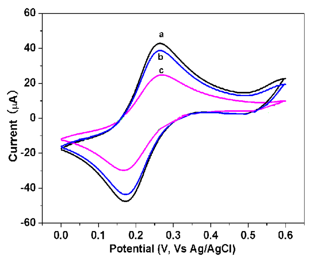 We used the modified AuE as the working electrode, a saturated calomel electrode as the reference electrode, and a platinum wire electrode as the auxiliary electrode. The cyclic voltametry curve was recorded in the voltage range of 0.0–0.6 V in 0.1 mol/L potassium chloride solution containing 5.0 mmol/L [Fe(CN)6]3−/4− (scanning speed 100 mV/s) (Figure 2). The nano-Au-MWCNTs/PDDA composite membrane-covered electrode possessed a pair of reversible redox/oxidation peaks (curve a, Figure 2). When the anti-trypsin antibody adsorbed to the surface of the composite membrane, the current decreased (curve b, Figure 2). When the trypsin bound to the anti-trypsin antibody fixed on the electrode, the current decreased further (curve c, Figure 2).