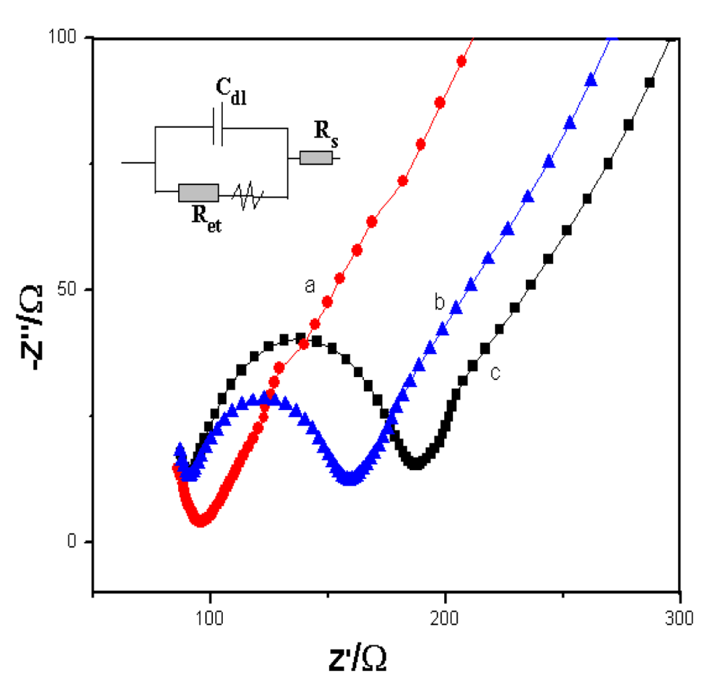 Electrochemical impedance spectroscopy (EIS): we monitored the change of electron transfer resistance (Ret) value on the AuE, Ab1-AuE, and antigen-bound Ab1-AuE electrodes in 0.1 mol/L potassium chloride solution with 5.0 mmol/L [Fe(CN)6]3−/4−. The electron transmission of [Fe(CN)6]3−/4− on the modified electrode possessed a small diameter, indicating that the electrons on the surface of AuE could be quickly transferred (curve a, Figure 3). When the anti-trypsin antibody absorbed to the surface of electrode, the resistance value increased dramatically (curve b, Figure 3); this was attributable to the absorbed antibody, which would impede the electron transmission, onto electrode surface. These data also indicated that the antibody was successfully absorbed onto the surface of the electrode. After trypsin bound to the antibody-modified electrode, the resistance value was further increased (curve c, Figure 3). The AC impedance and cyclic voltammetry curves of different modified electrodes were consistent, indicating the successful preparation of the electrochemical immunosensor.