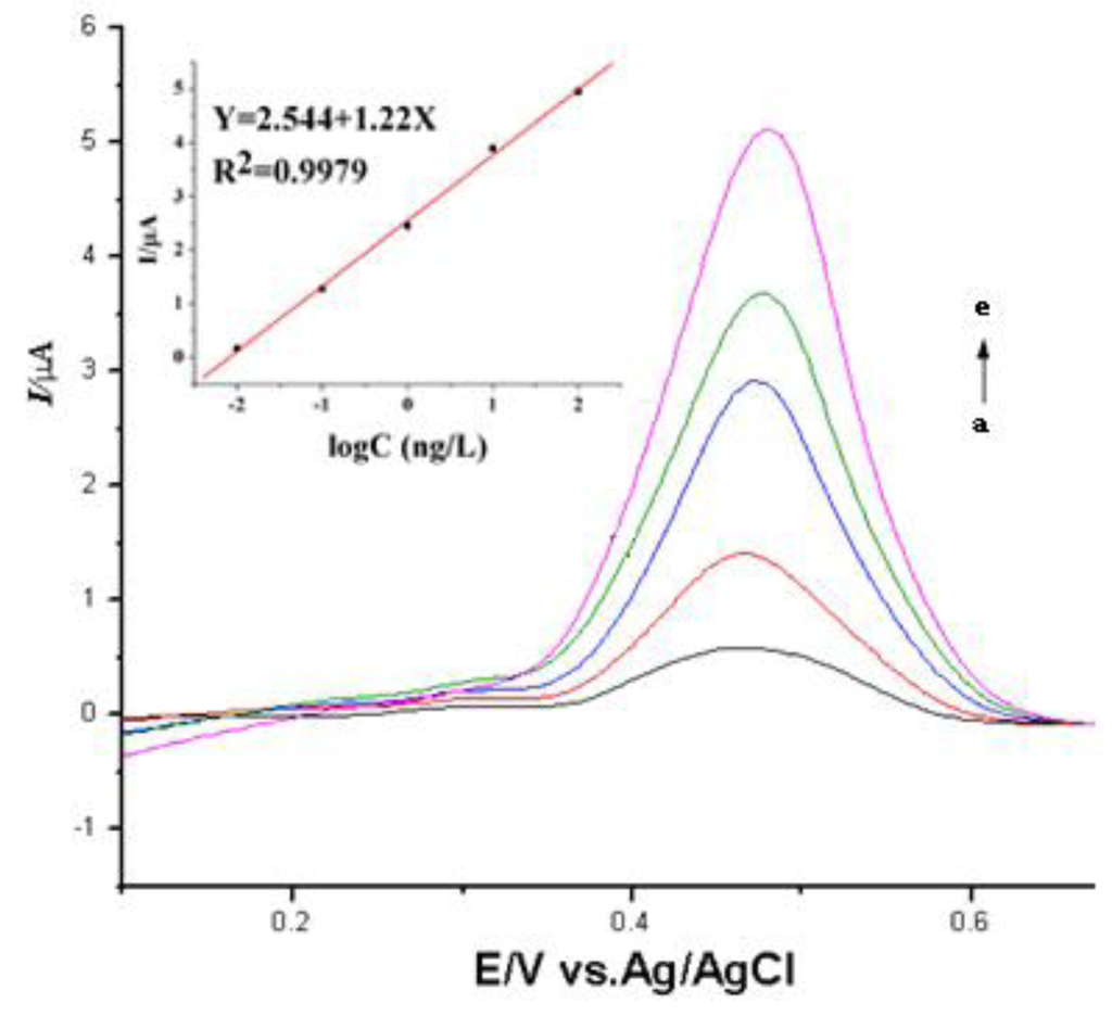 After fixation of the anti-trypsin antibody, the electrode of the electrochemical immunosensor constructed in this study could be stored in PBS at 4 °C for 2 weeks. The signal was relatively stable and could be maintained at 90% consistency between different electrochemical immunosensors manufactured by the same method, indicating long-term stability.