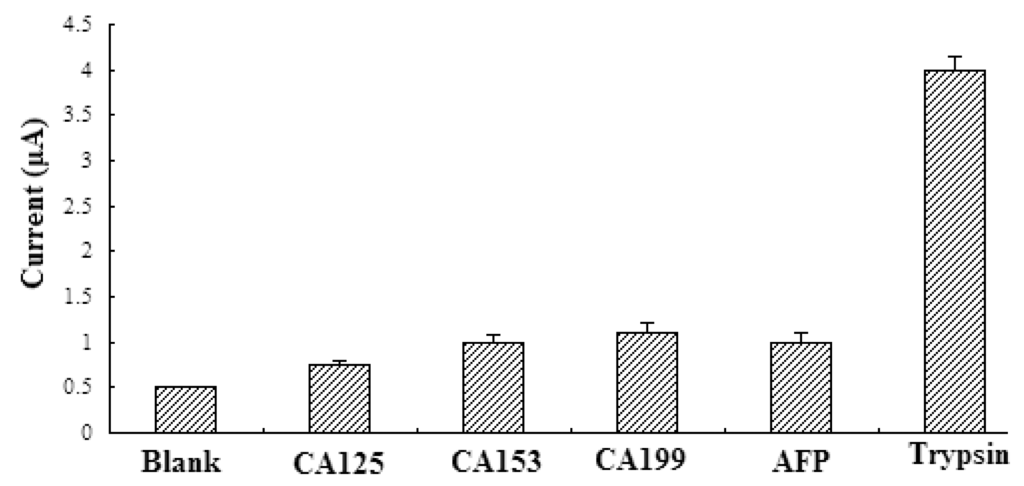 The ability of the sensor to detect trypsin in complex mixtures was tested first by using a mixture of trypsin and other tumor marker. Trypsin samples mixed with several common tumor markers (including carbohydrate antigens CA125, CA199, CA153, and α-fetoprotein [AFP]) at concentrations 10–1000 times higher than that of trypsin were tested using a differential pulse voltamtery (DPV) assay. The signals of other tumor markers were markedly smaller than that of trypsin (Figure 5). The interference signals of the CA125, CA153, CA199, and AFP proteins were close to that of a blank solution, lacking any proteins, which indicated the high selectivity of the electrochemical immunosensor.