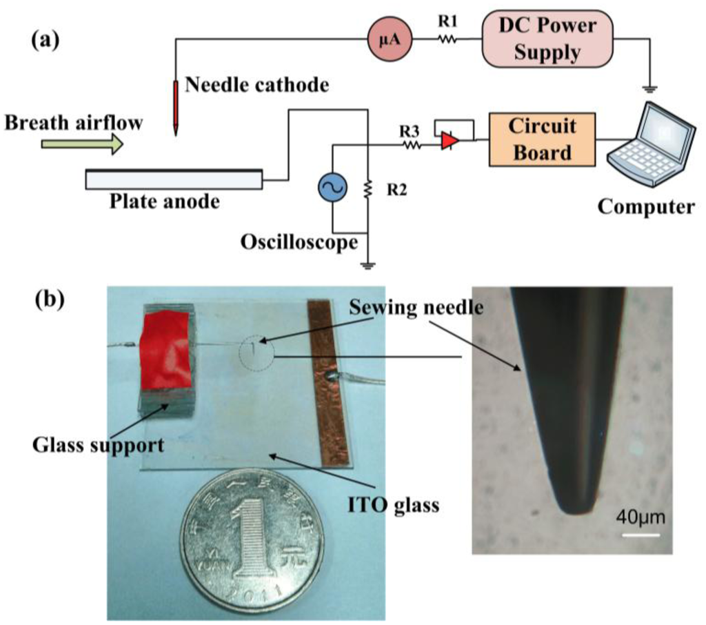 Since a miniaturized gas ionization sensor using CNTs was reported by Modi et al. [15], many studies on field ionization sensors have been performed [16–19]. Gas ionization sensors work by fingerprinting the ionization characteristics of gases [15]. The prebreakdown current or voltage was usually measured as the sensing signal, but the current was very small and on the order of pA, which was not very easy to measure. Much effort has been done to extensively lower the external voltage for the sensor making it suitable for low voltage electronics integration [20–22]. Our goal is to develop a simple low-cost breath sensor with good performance for in-home use. In this paper, we propose a method of respiratory monitoring by field ionization sensor based on Trichel pulses (TPs). TP is an interesting phenomenon of weak partial discharge which is characterized as highly regular current pulses. Respiration can be easily monitored by the measurement of repetition frequency rather than the amplitude of breakdown current. The TPs-based breath sensor is very simple and only requires a sharp electrode and a plate electrode with a constant voltage applied to them. There is no need for particular materials or any complicated manufacturing.