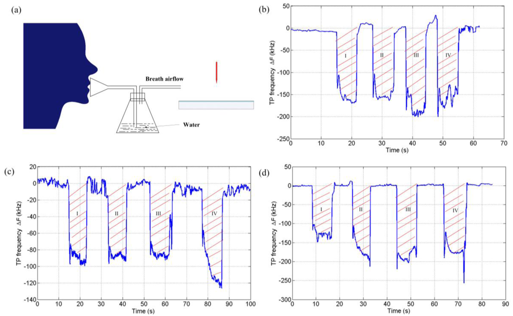 It can be noticed from Figure 3 that the detailed responses of the sensor for different subjects are different. More information about the respiration, e.g., the strength, tidal volume, even the breath composition, can be extracted from the variation curve of TP frequency, just as proposed in [9]. In this work, the vital capacity (VC) assessment was conducted with the TPs-based sensor. As the water vapor in breath would have an effect on the response as will be discussed later, the breath air went through a conical flask containing water before it reached the sensor to avoid the influence on the VC test due to the humidity differences for different subjects' breaths. Figure 4a shows the test scheme. The setup was kept unchanged except for the mouthpieces for different subjects. Figure 4b–d shows the variations of TP frequency with four times of consecutive VC test for three subjects. The area enclosed by the curve and the base characterizes the VC. The mean area for each subject was calculated and approximately equaled to 1.09e3, 8.95e2, and 1.36e3 for the subjects No. 1, No. 2, and No. 3, respectively.
