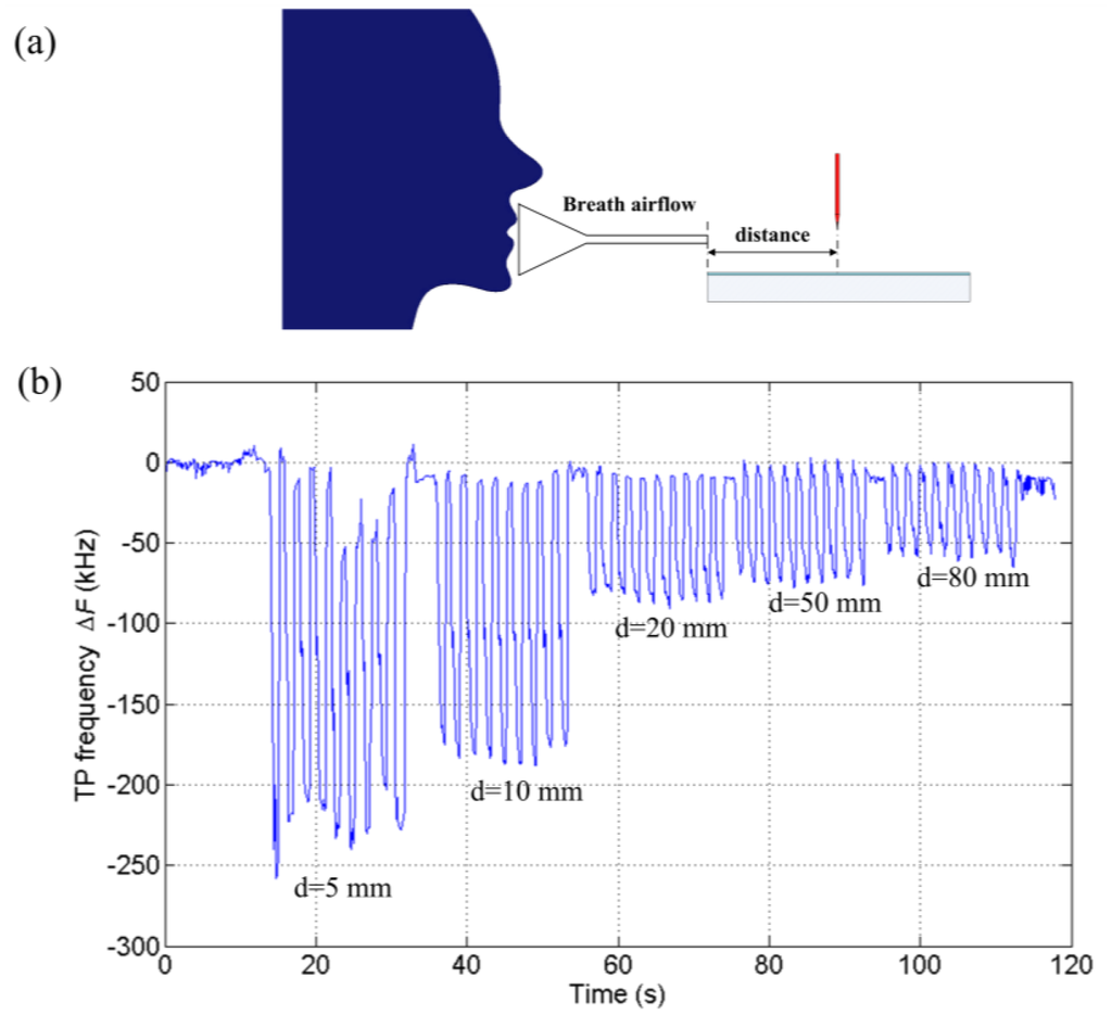 The effectiveness of TPs for respiratory monitoring has been demonstrated as shown above and the effects of breath airflow and water vapor in breath are investigated in this subsection. Airflow would have an impact on the TP frequency and make it tend to decrease [31,33]. Generally, the larger the flow velocity is, the more the TP frequency reduces. To validate this, experiments were performed. The breath air velocity was adjusted by changing the distance between the gas tube and the needle as is shown in Figure 5a. The subjects took steady breaths continually with changing distances. Figure 5b illustrates the variations of TP frequency with different distances. Apparently, the magnitude of change decreases with increasing distance. It was also found that only the airflow in the limited discharge area close to the needle tip would effectively impact the TP frequency. If the direction of the small gas tube shifted from the symmetry axis between the needle and the plate, the effect of airflow would be weak. That is to say, the turbulence in ambient air or airflows outside the discharge gap will not influence the response of the TPs-based sensor. It only requires the breath airflow act on the small discharge area.
