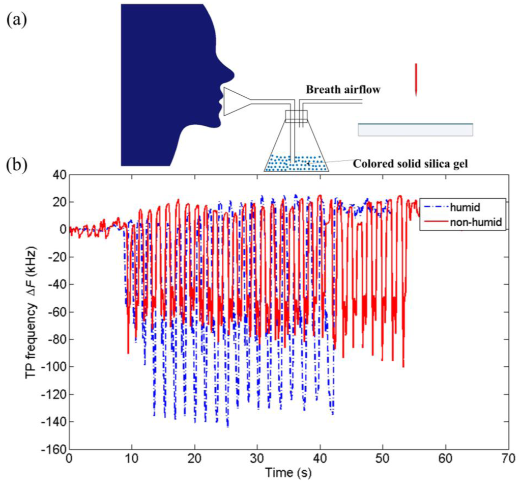 It was found that the breath airflow did not fully account for the high sensitivity of the TPs-based sensor. The TP frequency would not keep decreasing with increasing flow velocity but rather tend to be unchanged as shown in [31]. The chemical composition, e.g., the water vapor, in breath may also have an effect on the change of TP frequency. In this work, the effect of water vapor was studied by changing the humidity of breath air. The breath air went through a conical flask containing colored solid silica gel before it reached the sensor as shown in Figure 6a. To compare the difference between humid and non-humid breath air and avoid the influence of other factors, e.g., the flow velocity, the experiment for dry breath air was taken with unused colored solid silica gel absorbing the water vapor while the experiment for humid breath air was taken with the same amount of saturated solid silica gel. The same subject was required to participate in the both experiments with normal steady respiration. The test results are shown in Figure 6b. Obviously, the water vapor in breath air reduces the TP frequency significantly. The water containing in the exhaled flow was in atomized state [34]. This is different from the water in ambient air and of great importance for the response of the TPs-based sensor. It will be shown later that the humidity of ambient air has a totally reversed impact on the TP frequency. Moreover, since many volatile compounds and even charged particles are also included in the exhaled flow [34], they may also have some effects. This may lead to electrical respiration sensing of both dynamic and chemical characteristics in a single sensor, which is our future interest and needs more work.