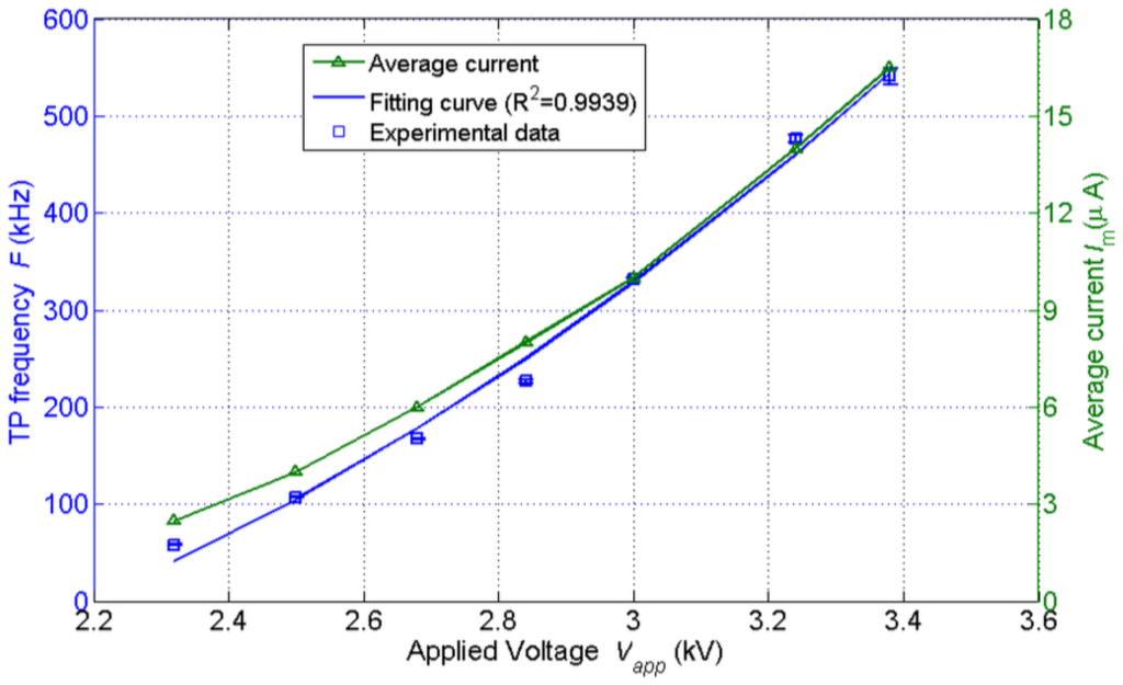 Systematic experimental studies have been done previously [35]. In Reference [35], the effects of curvature of needle, gap spacing, and applied voltage on the TPs were investigated. The TP frequency was a function of these parameters and the relationship could be analytically expressed as follows [35]: