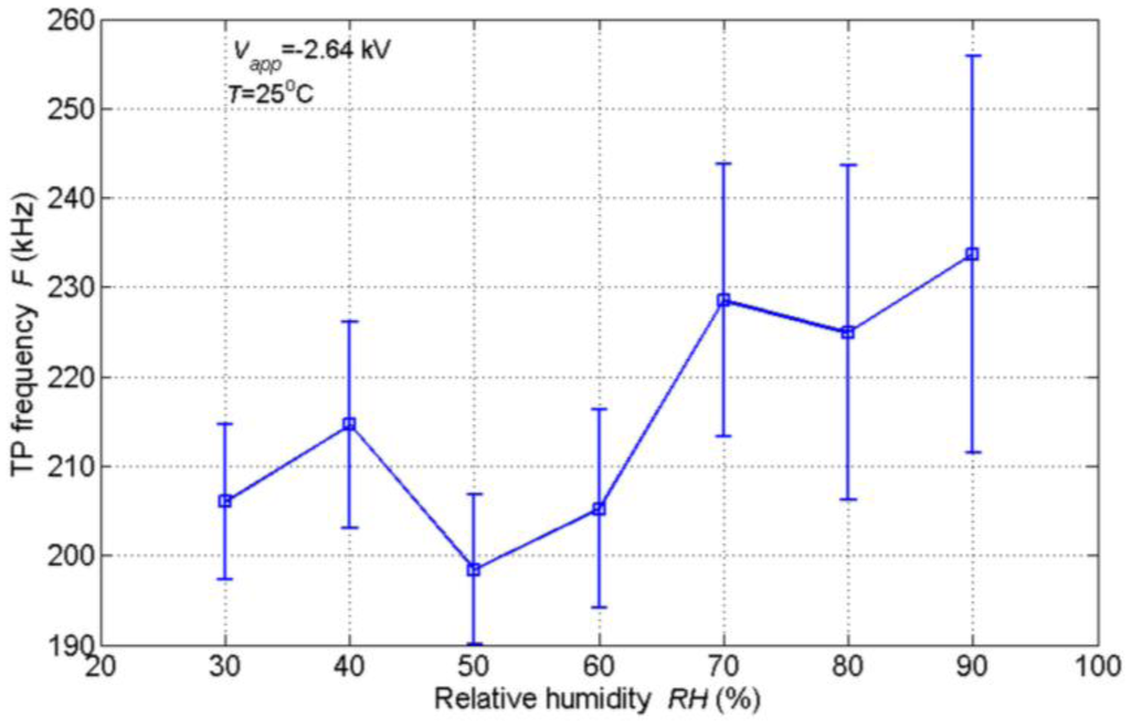 Since the sensor worked in open air in the above experiments, the changes in ambient temperature and relative humidity may have an influence on the TP frequency. Experiments were also conducted to investigate the influences. The NTP was placed in a temperature/humidity chamber (SH-261, ESPEC, Osaka, Japan) which could provide specific temperature and relative humidity environment. In the temperature experiments, the temperature varied from 15 °C to 40 °C with the relative humidity being uncontrolled. The applied voltage was −2.64 kV and the other parameters were the same as above. Figure 8 shows the variation of TP frequency with temperature. In general, the TP frequency increases with temperature. When the temperature is relatively low, the TP frequency shows small changes. However, when the temperature is relatively high (over 30 °C), the changes become bigger. The diffusions of molecules as well as the ions speed up with increasing temperature. The movement of negative ions is faster and leads a higher TP frequency at a higher temperature. However, the movements of negative ions consist of diffusion and drift components. The former is related to the thermal motion and concentration gradient while the latter is driven by the electric field which is much faster. Thus, the influence of temperature is not great.