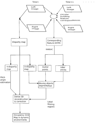 This paper is organized as follows. Section 2 reviews several research works in motion analysis from a moving platform and visual-based occupancy grid mapping. In Section 3, we explain the foundations of the sensor model for our stereoscopic system and the definition of the dynamic occupancy grid map. Approaches to compute the disparity map and its variations, U-V disparity maps, are described in Section 4. In Section 5, a sparse feature point-based motion analyzing method and an independent moving objects segmentation method in the disparity domain are presented. Section 6 presents a probabilistic occupancy grid mapping technique representing both obstacles and moving objects. Section 7 shows experimental results with real data sets. Section 8 summaries this paper and provides prospects for future improvements.