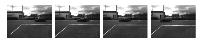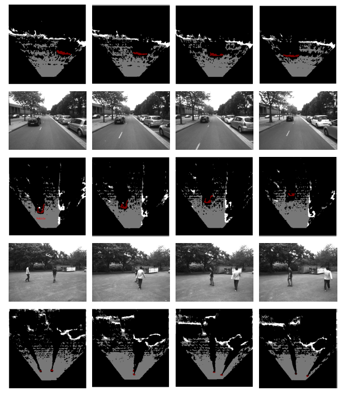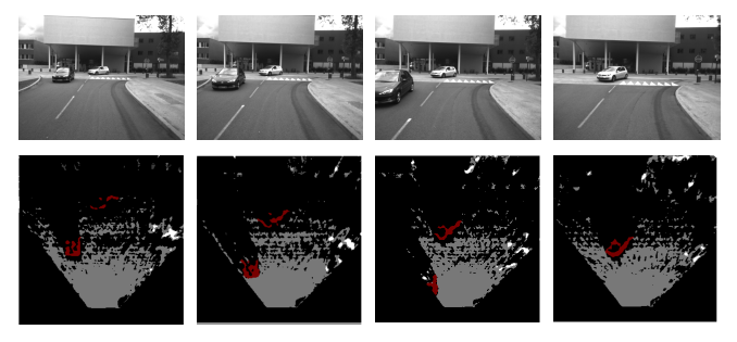 Figures 10 and 11 show the performances of the proposed method in 4 typical video sequences. The corresponding dynamic occupancy grid mapping results are shown under the sequences. Dynamic occupied areas are labeled in red, the white and gray cells represent occupied static areas and free space, respectively, while black cells are undetected areas. The Table 1 represents the precision evaluation of the proposed independent moving objects segmentation method in the 4 sequences. “TP” and “FP” are short for “true positive” (detecting and segment moving objects successfully) and “false positive” (taking static objects as dynamic objects; this is usually caused by noisy matched feature points). From the results, we could see that the proposed framework performs well when there are moving vehicles in the scenario. However, the performance degenerates when pedestrians appear. The major reason is that a moving pedestrian is slower than a moving vehicle. Hence, several detected feature points in a moving pedestrian are classified as static. This problem would cause a moving pedestrian to not be detected. At last, the whole computation time including motion analysis and dynamic occupancy grid mapping is 0.5 s on average (SGBM disparity calculation (0̃.25 s), visual odometry (0̃.1 s), moving object detection and segmentation (0̃.1 s), dynamic occupancy grid mapping (0̃.05 s)).