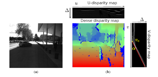 One attribute of V-disparity is that the ground plane is projected into a line, as the red line drawn in Figure 3b. Let the equation of the ground's projection in the V-disparity plane be: V = αΔ + υc, where α is the slope, Δ is the disparity and υc is the value when Δ = 0. It can be inferred that a plane with equation Z = aY + d in the world coordinate system is projected in V-disparity as [30]: