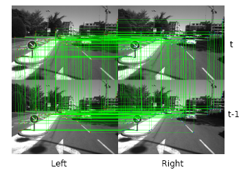 Survival rate: Both the KLT tracker and feature matching method would lose a part of the feature points because of inaccurate tracking or matching. When tracking or matching through four images, this phenomenon could be amplified and cause severe problems. The survival rate is calculated by , where nwhole is the number of whole detected features and nleft is the number of successfully tracked or matched features.