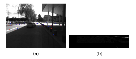 In parallel with sparse feature processing, a dense stereo vision processing is performed for further independent moving object segmentation and dynamic occupancy grid mapping. Because of the good performances in both accuracy and speed, the semi-global block matching (SGBM) algorithm [28] is employed to compute dense disparity image IΔ. Figure 3b shows a disparity image calculated from Figure 3a by the SGBM algorithm.
