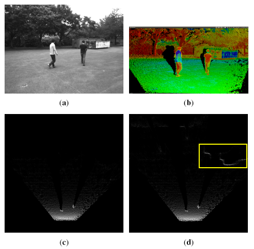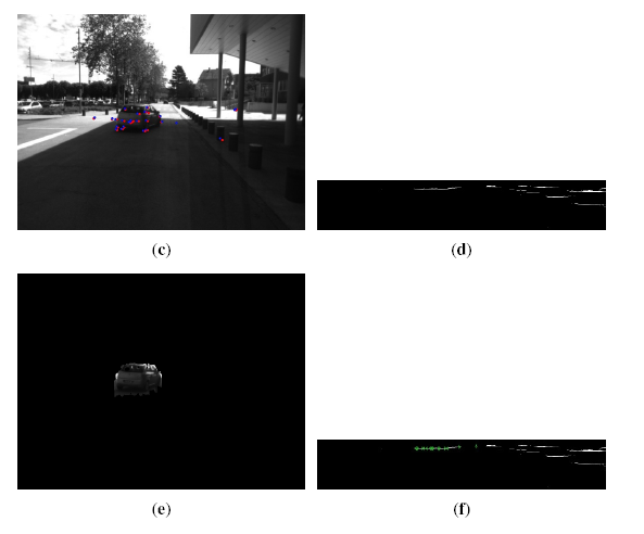 At last, confirmed segments in the U-disparity map are back projected to the dense disparity map to get independent moving objects in the dense disparity map. An example is shown in Figure 5e.