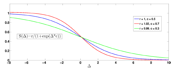 The corrected 3D points are assigned to cells with pre-defined sizes with respect to their positions. In each cell C(i, j), the number of assigned points ni,j is counted. In addition, the number of 3D points extracted from the independent moving segmentation calculated in Section 5.2 is counted as . When trying to compute a cell's occupancy probability with respect to the number of 3D points it holds, a similar problem is encountered again as in Section 5.2. Looking at Figure 7a, the cells on the ground near the stereoscopic system always hold more points than the grids far away. Directly estimating the occupancy probability from the absolute number of points would always lead to a faulty decision. In the literature, [2,24] do not mention this problem, while [25,26] avoid it by a previous separation of road pixels. In our method, this problem is overcome also by sigmoid function-based adjustment. The absolute number of points for cell C(i,j) is adjusted as: