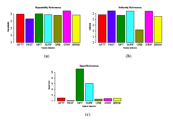 Several general criteria used for evaluating the feature detector are given in [38,45]. Being different from applications, such as object recognition, which usually have prominent scale or viewpoint changes, in our applications, the detectors are used to establish point correspondences between consecutive video frames. Therefore, the scale and viewpoint changes are too small to be evaluated in our application. The performances of feature point detectors in our application are evaluated from 3 aspects: repeatability, uniformity and speed.