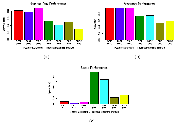 In Sections 5.1.1 and 5.1.2, we have reviewed several image feature detectors and descriptors. Here, we will evaluate their performances for motion analysis in our application. The evaluated feature detectors are: GFTT, FAST, SIFT, SURF, ORB, STAR and BRISK; and the feature descriptors are: SIFT, SURF, ORB and BRISK. For a fair comparison, all of the feature detectors and descriptors use default parameters implemented in OpenCV.