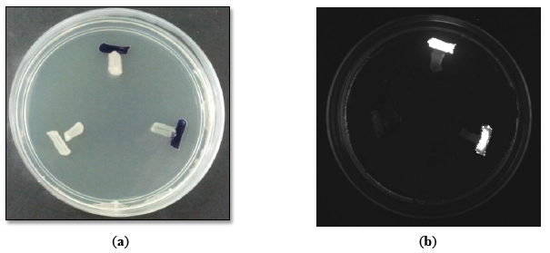 Preliminary screening of the AHL production with CV026 (Figure 1a) and E. coli [pSB401] (Figure 1b) indicated that the M004 strain produced short chain AHLs [17,18]. This strain was then subjected to molecular identification.