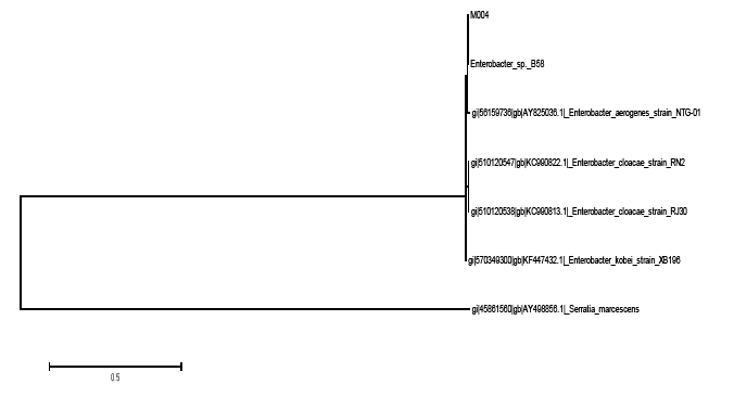 The identity of strain M004 was confirmed by 16S rDNA gene sequencing showing that it clustered within the Enterobacter genus. The strain shared 99% similarity in the BLAST search. Based on the phylogenetic tree constructed (Figure 2), strain M004 may represents a new species of the Enterobacter genus. More analysis should be performed to further confirm this finding.