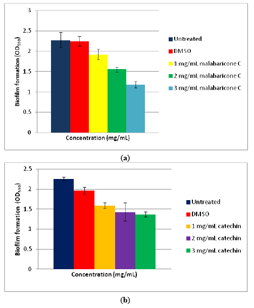Biofilm formation is often a QS-regulated phenotype [26,27]. The formation of biofilms often initiates with bacteria colonization followed by surface attachment and finally biofilm development and maturation. The ability of bacteria to form biofilms is often linked to pathogenic traits during chronic infection. There are several reports that the members of Enterobacter possess the ability to form biofilms [27,33]. Enterobacter sp. M004 has been shown to be able to form biofilms (Figure 4). In our study, we used two anti-QS compounds that have been reported, namely catechin [25] and malabaricone C [26], to inhibit the biofilm formation by Enterobacter sp., strain M004 whereby both catechin and malabaricone C reduced the biofilm formation in Enterobacter sp., strain M004 in a dose-dependent manner (Figures 4).