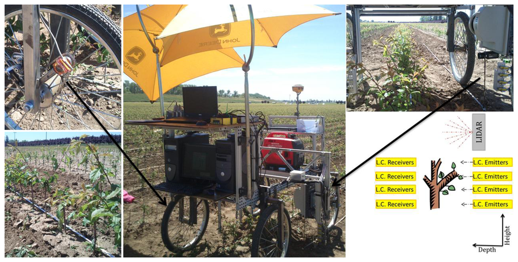 A rotary encoder wheel was coupled by a timing chain to one of the wheels for vehicle odometry and used to conduct the evaluation and comparison of the different sensors (Figure 1). This arrangement provided a measurement of the linear displacement of the prototype vehicle along the row of tree seedlings and formed the spatial basis for each recorded sensor measurement.