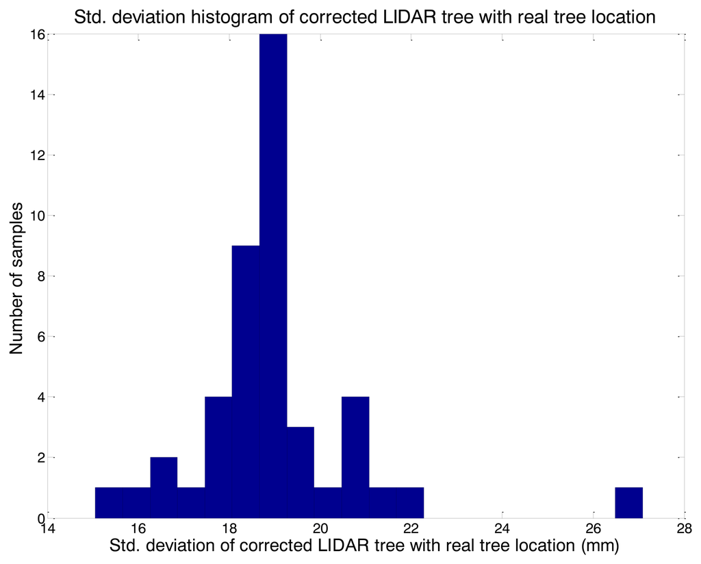 Figure 10 is a histogram of the standard deviation of a correct tree LIDAR location and a real tree location. All of the tests were considered and grouped according to the parameter values during the independent evaluations. A low error value did not indicate an improved performance of the sensor because this may lead to a greater number of false positive or false negative tree detection. For example, using the lowest tree location error, which was 1 mm less than the actual observation, would result in a reduction in tree detection of up to 86%.