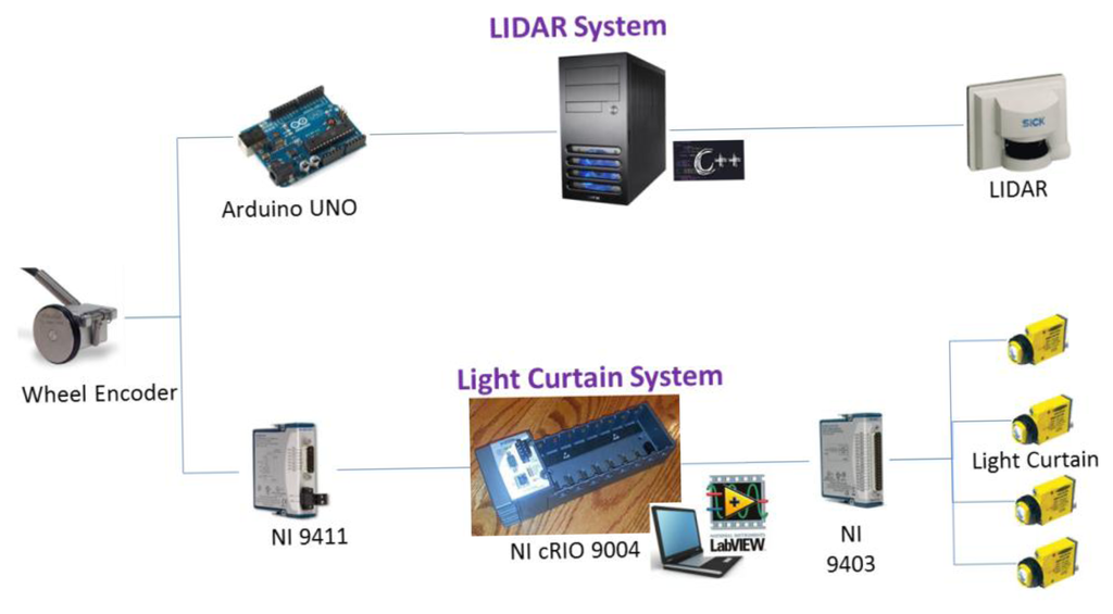 All of the necessary components for each of the aforementioned systems (LIDAR and light curtain, Figure 2) were recorded in a parallel fashion using the encoder value for future event synchronization and evaluation. In this way, two independent files were obtained from each optical sensor system and test.