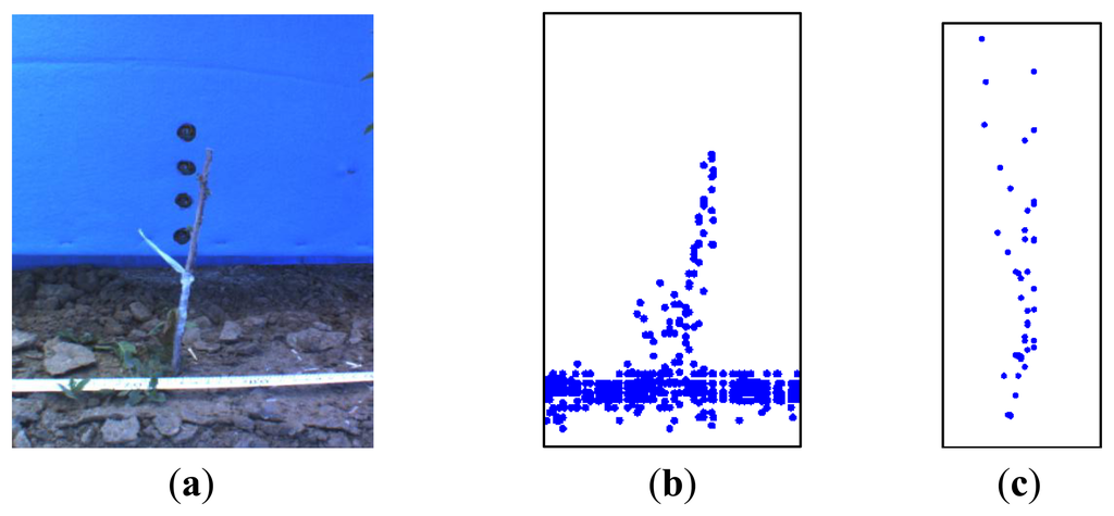 The analysis of these initial values showed an outlier effect of the depth for laser values. According to previous studies: “An outlier is an observation that deviates so much from other observations as to arouse suspicion that it was generated by a different mechanism. Large errors or outliers can be caused by different sources and they are mainly measurements that do not belong to the local neighborhood and do not obey the local surface geometry. As the footprint of the laser beam is not a geometrical point, but an ellipse, when it hits a boundary of an occlusion (i.e., the tree), it is divided into two parts, each of which radiate one of the front and the back surfaces incident to the occlusion boundary. Thus, the irradiance at this point would be a weighted average of the irradiance reflected by both surfaces” [] and in the case of a tree row does not represent a true point on either the tree or the background, but is an artifact of the beam size and the size of the juvenile tree. The tree stem detection in our study showed this outlier effect (Figure 3) was enhanced because the object to be scanned (one-year-old grafted almond trees) was normally smaller than the spot diameter of the laser (according to the manufacturer's documentation, an LMS 221 had a spot diameter of approximately 3 cm at a 1 m distance) [].