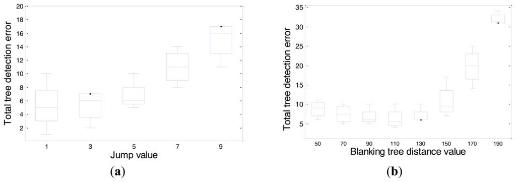 Based on an independent set of evaluations (Figure 4), the values at which a minimum number of tree detection errors were obtained were as follow: a height cut of 21, an encoder range of 200, a path increment of 5 a cut identification of 19, a jump of 1, and a blanking tree distance of 110.