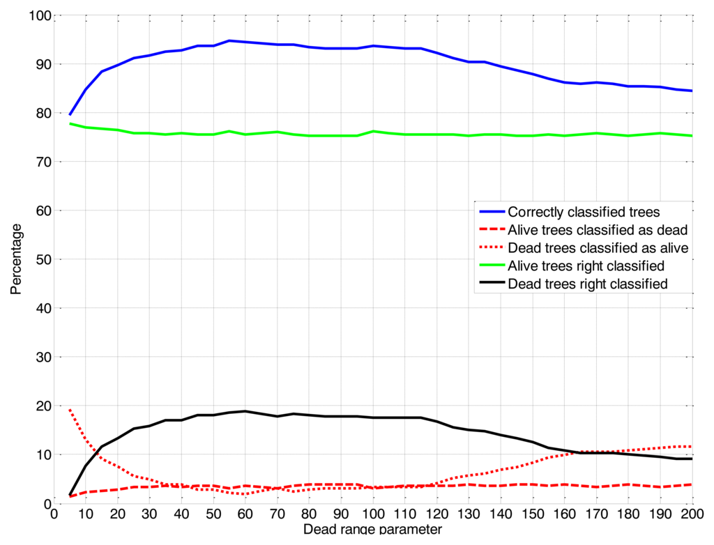 According to the number of detections inside the dead range window and the actual state of the tree, which was obtained manually during the test, the detection threshold (threshold count parameter) was obtained, which difference live trees from dead trees at 95th percentile of alive trees.