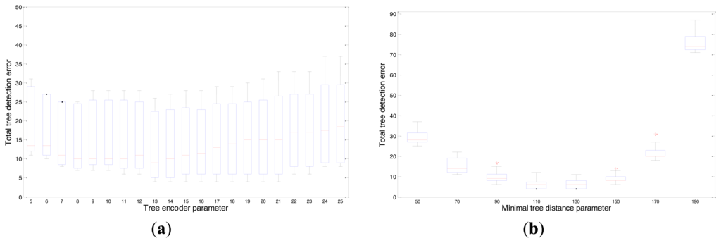 This methodology was conducted through an evaluation range of the tree encoder parameter from 5 to 63.5 cm steps of 1 encoder values and a minimal tree distance parameter, from 127 to 482.6 cm steps of 20 encoder values. Table 4 shows the values of the parameters for which optimum results were obtained. Values were selected according to the total number of false detections (Figure 6). At equal false detections values, the standard deviation error was used as a selection criterion. Finally, a value of 13 was selected for the tree encoder parameter and 130 was selected for the minimal tree distance parameter.