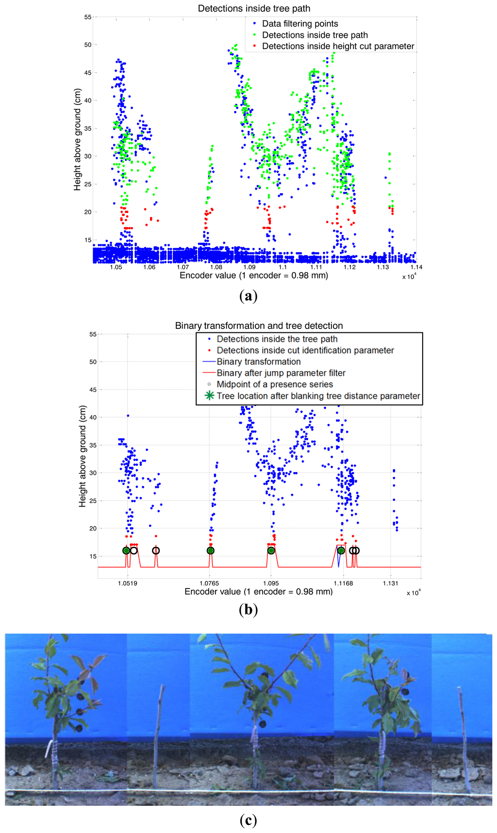 The initial, final and median encoder values were obtained from each presence series. The potential tree detection was removed when the distance in the encoder values from its midpoint to the previously detected tree midpoint was lower than a threshold (blanking tree distance parameter).