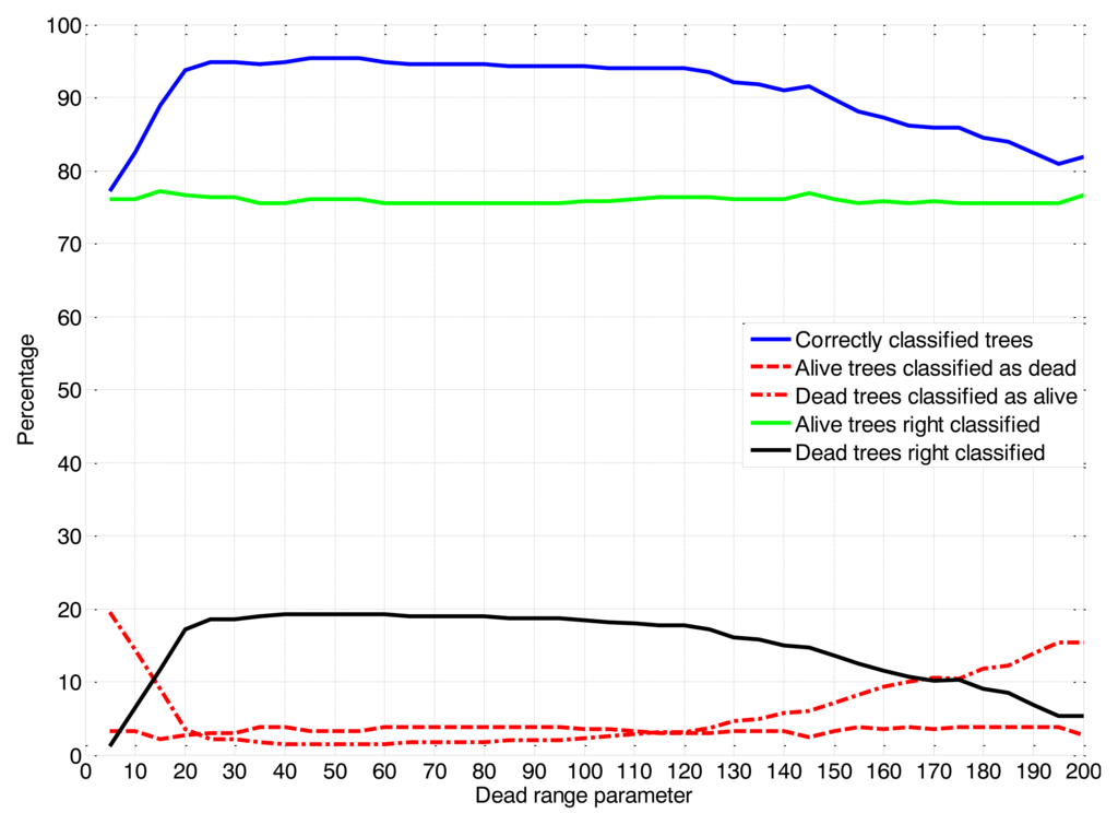 According to the number of detections inside the dead range window and the actual state of the tree, which was obtained manually during the test, it was obtained the detection threshold (threshold count parameter), which difference live trees from dead trees at 95th percentile of alive trees.
