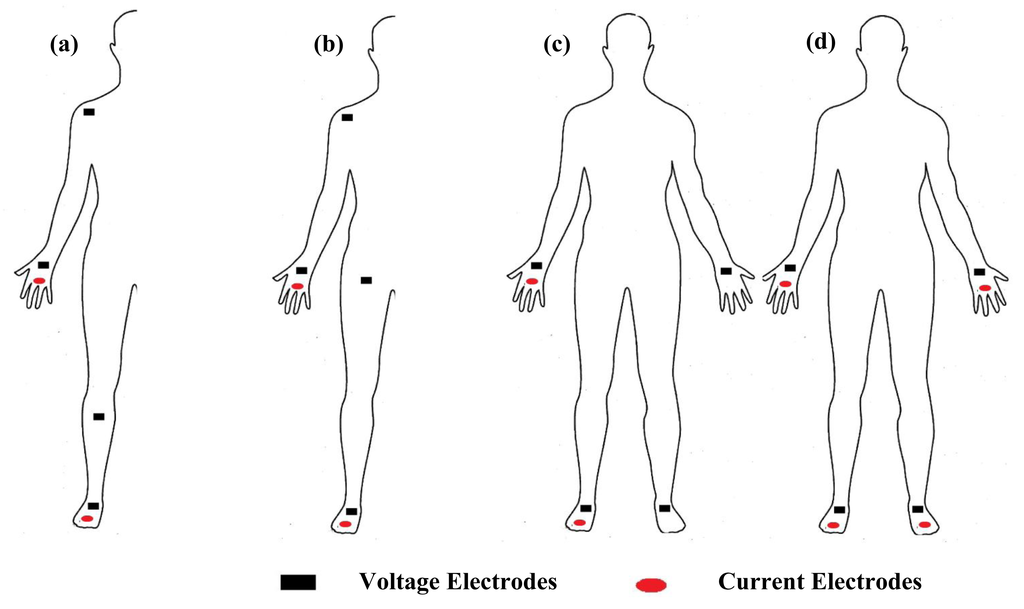 Measurement of segmental bioimpedance can be achieved through four types of protocols. The first approach, as suggested by Scheltinga et al. [56], uses dual current injection electrodes on the proximal area of the right forearm and lower leg, and quad voltage electrodes placed on the right proximal forearm, shoulder, upper thigh and lower leg (Figure 4a). The second approach is suggested by Zhu et al. [57], through the sum of segments technique, that uses dual current injection electrodes on the right wrist and foot, and quad voltage electrodes placed on the right wrist, shoulder, upper iliac spine and foot (Figure 4b). A third approach was presented by Organ et al. [58], who suggested the use of dual current injection electrodes on the right wrist and foot, and quad voltage electrodes, two placed on the right wrist and foot, and two on the left wrist and foot (Figure 4c). The fourth approach as suggested by Jaffrin et al. [16,59,60], is through the use of quad current injection electrodes located on the right and left wrist and foot, and quad voltage electrodes located at the same place (Figure 4d).
