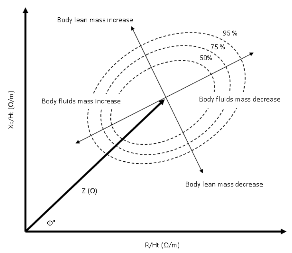 Bioimpedance analysis, as an independent method for the assessment of the human health status from absolute bioimpedance measurements, has triggered a new path of data analysis and interpretation. The bioimpedance vector analysis method (BIVA) is a novel approach established essentially by Piccoli et al. [64,65] to estimate the hydration status using height indexed resistance and reactance data (R-Xc graph) from bioimpedance measurements. Using 8,022 normal subjects (3796 female and 4226 male) Piccoli et al. [66] formulated 50%, 75%, and 95% tolerance ellipses that determine increasing and decreasing body mass if the minor vector falls in the left and right half of the 50% ellipse, along with increasing and decreasing hydration ratio if the major vector falls in the lower and upper half of the 50% ellipse (Figure 5).