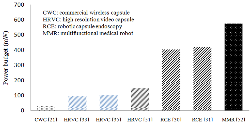 In RCE, the magnetic based actuation mechanism is one of the efficient control methods. This method consists of a small permanent magnet embedded inside the capsule which interacts with the magnetic field generated by a large external magnetic source resulting in an actuation force [22,23]. A similar principle also can be used for localization of the capsule as reported in [24]. The main advantage of such magnetic-based control is that it minimizes power demand at the RCE, because the power required at the RCE to achieve actuation and locomotion are almost negligible. Due to this capability, research in this field is still ongoing [25–27]. However, such magnetic-based RCE systems possess limitations in terms of portability, unlike other types of RCE systems such as on-board micro motor [28] and shape memory alloy (SMA) [29]-based portable RCEs. These kinds of portable active actuation and locomotion RCE systems, however, require high peak power [30]. The VECTOR Project (supported by the European Union) revealed that the peak power required will be at least few hundred mW after taking into consideration all the on board power-consuming modules within a RCE [30,31]. Moreover, some advanced features including microsurgery, drug delivery and biopsy are also anticipated for multifunctional medical robot (MMR) WCE [32,33] that will also increase the power demands of the new generation of WCE systems. Accordingly, it can be concluded that the peak power requirement for the new generation of WCE is becoming much higher than that of the existing WCE units and the battery capacity may not be sufficient [30,34,35]. This is the main bottleneck in realizing the new generation of WCE devices [36,37].