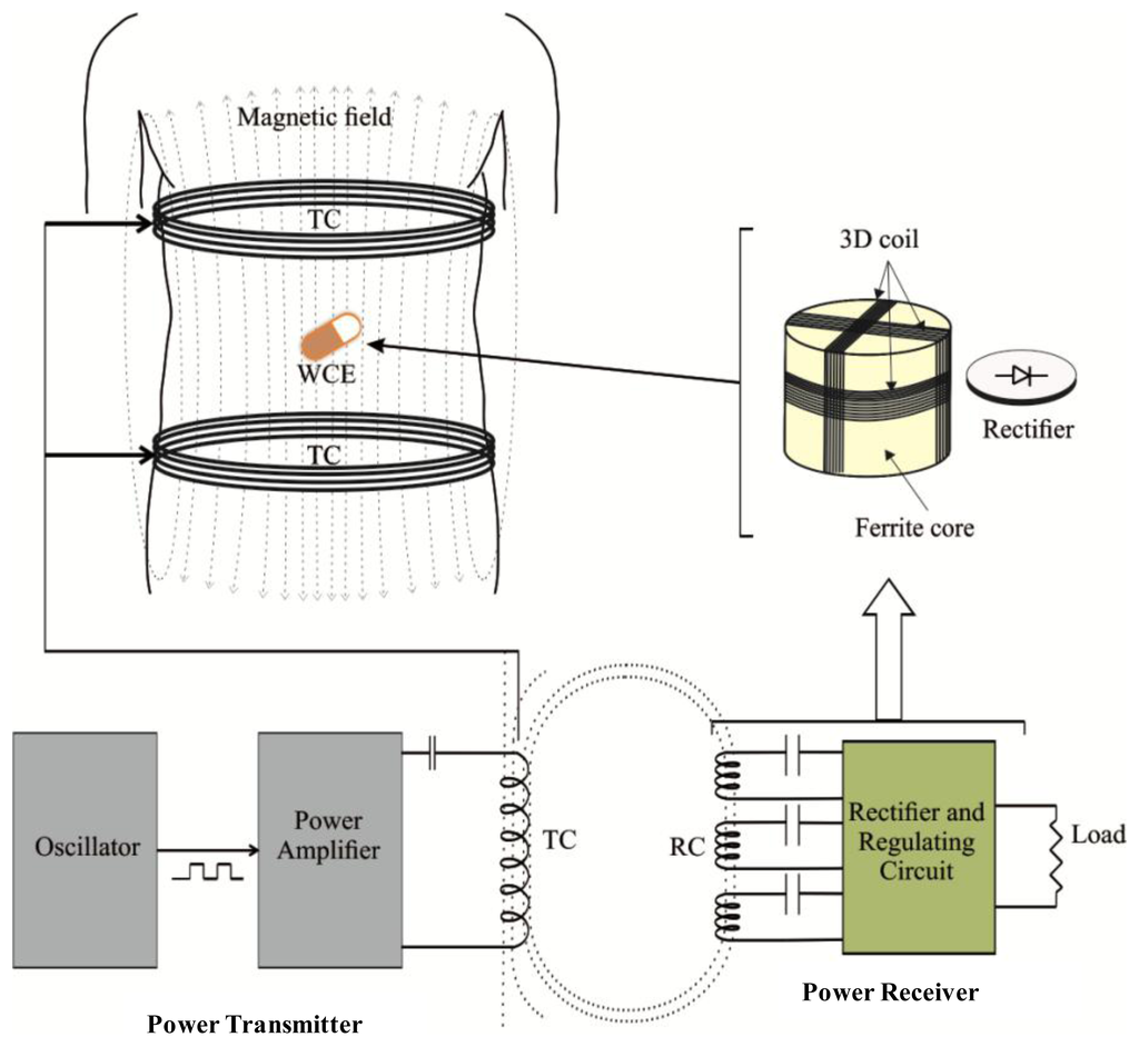 Wireless power transmission (WPT) system refers to a system that transfers electrical power wirelessly from a transmitter to a receiver in the form of electromagnetic waves. WPT systems can be divided into two different categories [53,54]: (i) radiative coupling; and (ii) inductive coupling. The best choice of any particular method is highly dependent on its application area. The radiative technique is well suited for applications that require far field transmission that generally involves farther separation between the transmitter and the receiver, whereas the inductive coupling is more suitable for near field applications where the distance is relatively shorter [55]. Considering the application environments, near field inductive coupling, based on electromagnetic induction between two coils, is well accepted for medical applications, and this includes wireless capsule endoscopy (WCE) [56,57]. A WPT system based on induction coupling mainly consists of two subsystems, the power transmitter and the power receiver, as illustrated in Figure 2. Generally, the power transmission section comprises an oscillator, a power amplifier circuit and a transmitting coil (TC) transverse to the body. On the other hand, the receiving section comprises of a three receiving coil (RC) set wound around a ferrite core, a rectifier and a regulating circuit. All the sub-components of the receiver are compacted inside the capsule. Both the TC and the RC resonate at the same frequency. A series resonating circuit (SRC) or parallel resonating circuit (PRC) is typically employed at the TC and RC to obtain resonance. The oscillator generates the desired excitation signal which is then amplified by the power amplifier. The power amplifier makes it possible for high amplitude electrical current to be supplied to the TC so that it produces a strong alternating magnetic field. This magnetic field interacts with the RC and induces an alternating current in the RC. It then is turned into a direct current (DC) by the rectifier, and finally the DC is smoothened and stabilized by the regulating circuit. For practical use of WPT system, it must fulfill the following requirements: (i) it must be able to deliver stable and sufficient power to ensure the smooth working of the WCE; (ii) the level of the electromagnetic field generated from TC must not harmful to human tissues and organs; and finally (iii) the receiving coil (RC) and its regulation circuit should be small enough so that it can be assembled into a small size capsule. The aforementioned conditions imposed challenges in WPT system design targeted for WCE.