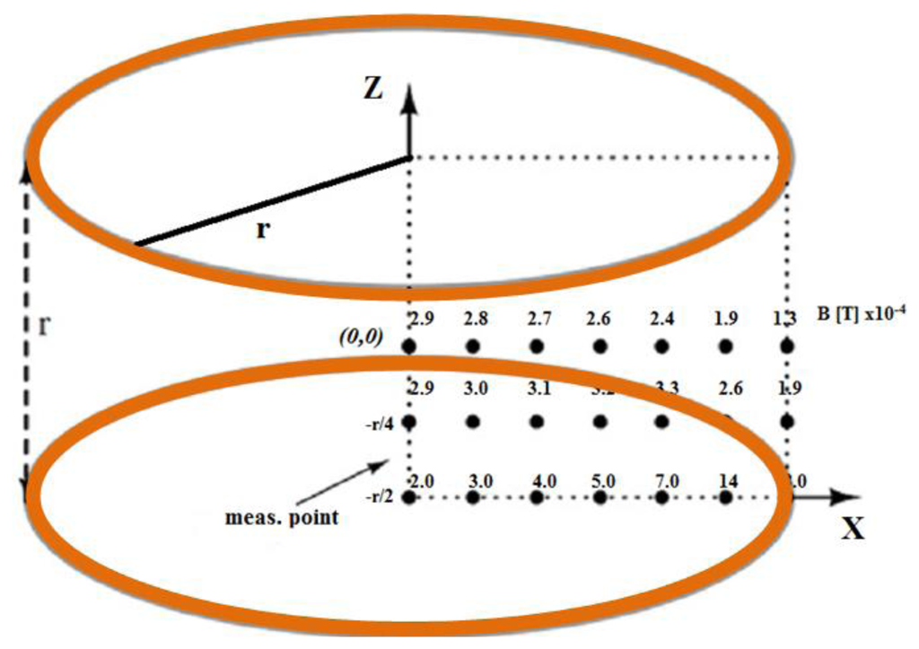 - Beiranvand, R. Analyzing the uniformity of the generated magnetic field by a practical one-dimensional helmholtz coils system. Rev. Sci. Instrum. 2013, 84, 075109. [Google Scholar]
