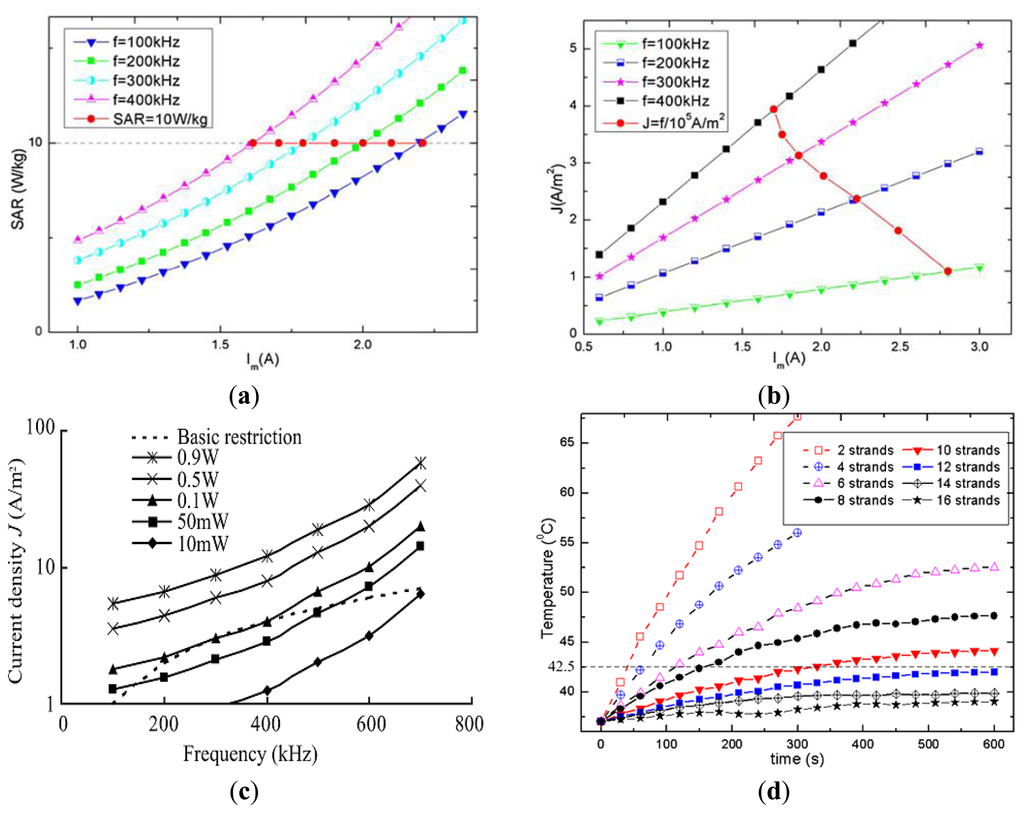 Moreover, safety is a major consideration for the clinical use of WPT systems and it must be ensured. According to the safety analysis, the safety indexes “specific absorption rate” (SAR) and current density must always be within acceptable levels [12,62,75,79]. However, the current density may exceed the restrictions standardized by ICNIRP under certain system frequency and driving current levels applied to the TC. The current density increases along with increasing system frequency and driving current which impose the limit on the maximum system frequency and driving current to maintain the safety level [12,75]. The studies in [75,79] reveal that the SAR is mostly dependent on the terminal voltage of the transmitting coil (TC) but the current density varies according to the excitation current applied to the TC, so tuning of these two parameters may maintain the SAR and current density to be within the desired level. In addition, as the safety indexes are highly dependent on the voltage/current applied to the TC, the improvement of power transmission efficiency can make it easier to keep safety parameters well below the safety limit. As for the problem associated with RC temperature, this can be overcome by using multi-stranded wire as shown in [12].