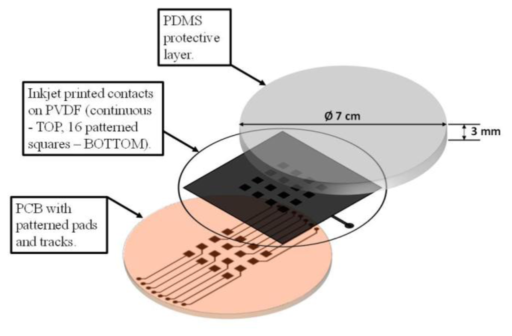 The electromechanical response of piezoelectric polymers can be recorded either in the form of charge generation or in form of a change in capacitance [24]. Accordingly, they can be easily manufactured and integrated with flexible PCB and electronic interface circuitry can be easily developed using off-the-shelf electronics. In particular, polyvinylidene fluoride (PVDF) has been chosen as piezoelectric polymer to build the sensor array. The PVDF film was a circular portion (diameter = 7 cm) of a commercial foil from MEAS—Measurement Specialties Inc. (Hampton, VA, USA).