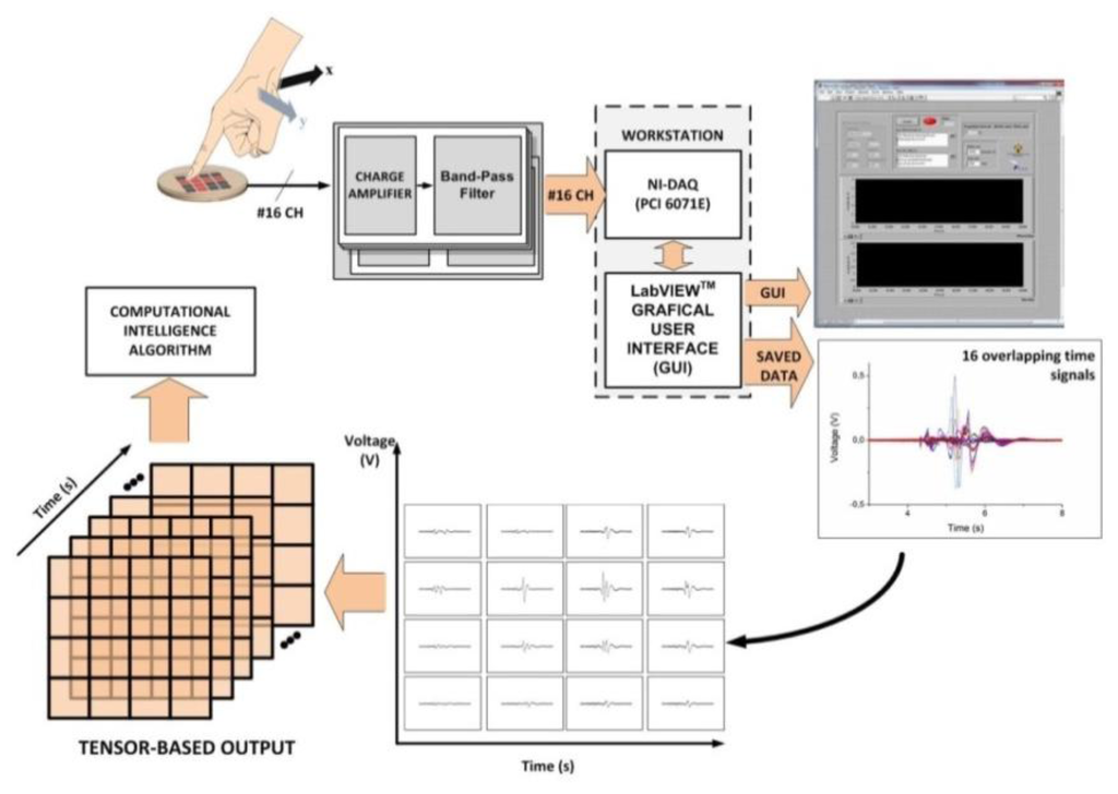 The subsequent step is to acquire the tactile system output data both to be visualized by the operator and to be processed by the pattern-recognition system for touch modality classification. For this aim, output signals are acquired at 3 k Samples per second by a DAQ board (NI PCI-6071E) and visualized by a LabVIEW™ graphic user interface (GUI) in the time domain.
