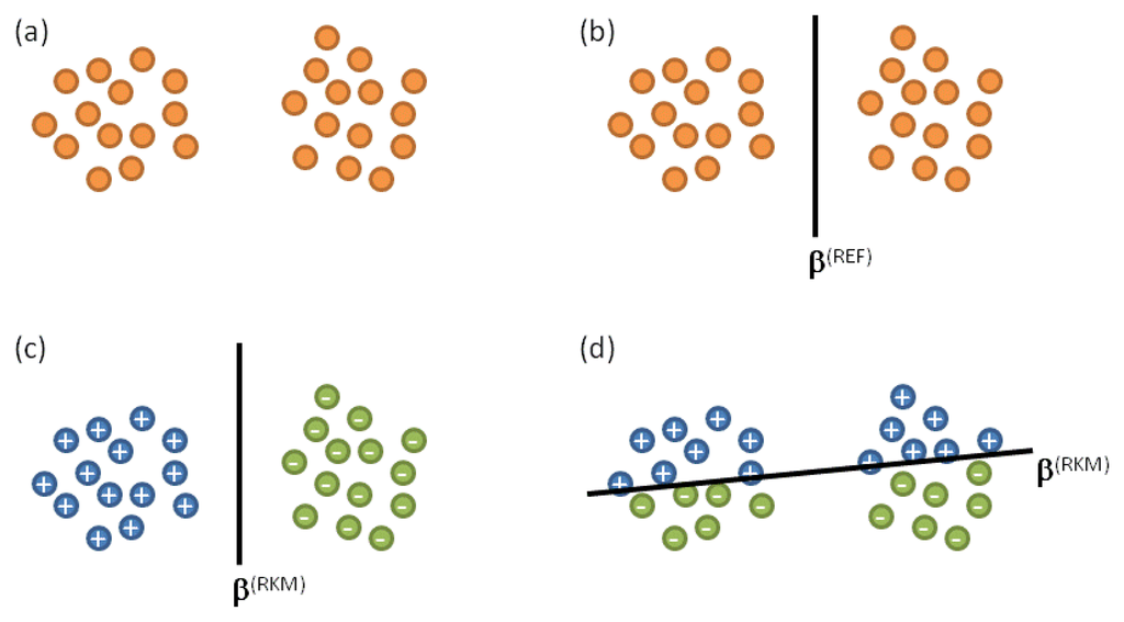 The rationale behind this approach can be explained by analyzing the configuration schematized in Figure 4. Figure 4a proposes a problem in which the data belonging to X are intrinsically organized in two clusters. Thus, the unsupervised evaluation of the dataset would lead to the situation illustrated in Figure 4b, which reports the approximate position of the hyperplane β(REF). One may conclude that β(REF) characterizes the “natural” distribution of data. On the other hand, the position of the hyperplane β(RKM) would result from the analysis of the empirical data; i.e., β(RKM) is obtained by taking into account the actual labels associated to each pattern. As a result, two different situations may arise from the proposed example. Figure 4c refers to the first situation, in which it is supposed that clusters match the actual classes. Conversely, Figure 4d refers to the opposite situation, in which it is supposed that actual classes do not match the natural distribution of data. In the case of Figure 4c, β(REF) ≡ β(RKM); in the case of Figure 4d, β(REF) ∈ β(RKM). Therefore whenever the result of clustering matches the true distribution of pattern classes, the unsupervised separation surface β(REF) and the real classification surface must coincide βRKM). Of course, the opposite case may occur, in which the target distribution is totally uncorrelated with the obtained clusters. In general, however, β(REF) and β(RKM) set the constraints for the admissible solutions to the classification problem at hand, as proved in [41]. As a major consequence, such constraints should represent the reference when assessing χ by adopting the MD framework.